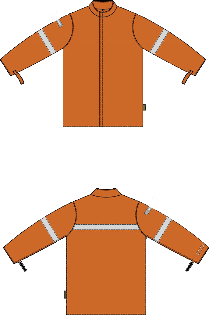 25mm flame resistant silver reflective tape across back, and 25mm flame resistant silver reflective tape around both biceps.