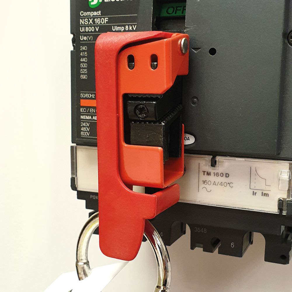 Device accepts all our safety padlocks and most lockout hasps with 8mm dia. locking hole for full lockout.