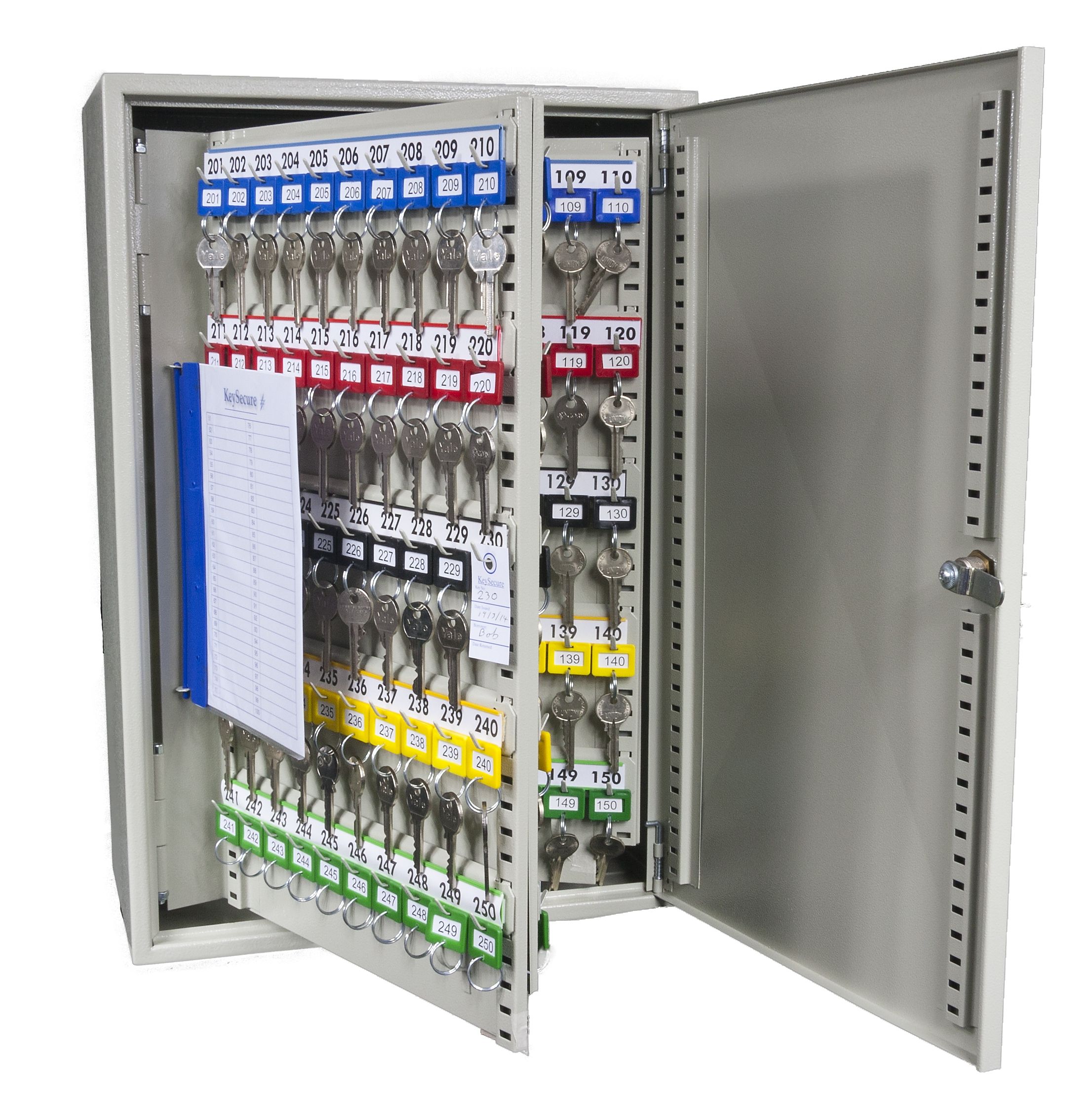 Strong steel constructed key cabinets with powder coated finish. Supplied with numbered colour coded hooks, key tags, card index, strong cylinder lock with two keys. The hooks in this range of cabinets are adjustable so can be positioned to suit varying key sizes