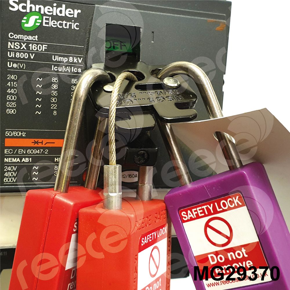 This device locates in the slot behind the switch toggle when in the off position, blocking its operation. Adding a padlock prevents unauthorised operation and secures the device in place when the breaker is in the off position.