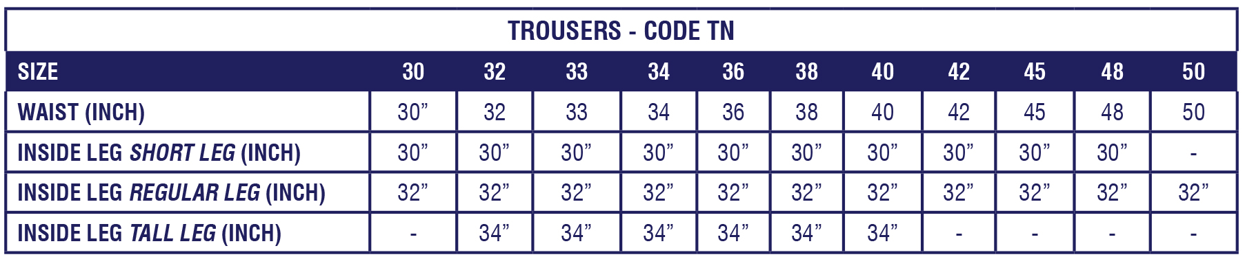 - Sizes: 34”-48” Short Leg (30”), 30” -50” Regular Leg (32”), 32”-40” Tall Leg (34”)